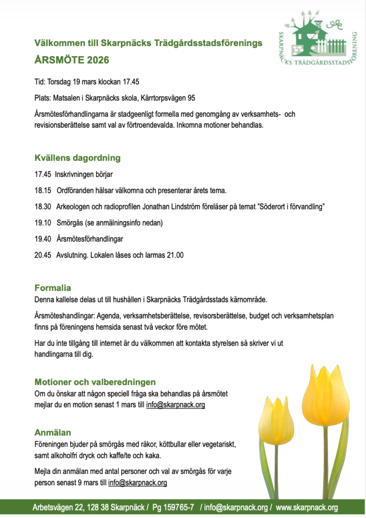 Välkomna önskar Skarpnäcks Trädgårdsstadsförening.